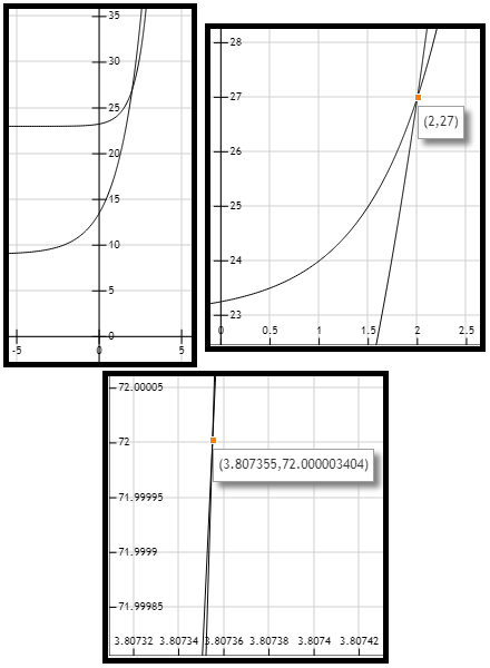 Figura 1. Gráficas de las curvas de las funciones \( f(x)=4^{x-1}+23 \) y \(f(x)=9 \left(2^{x-1}+1\right) \).
