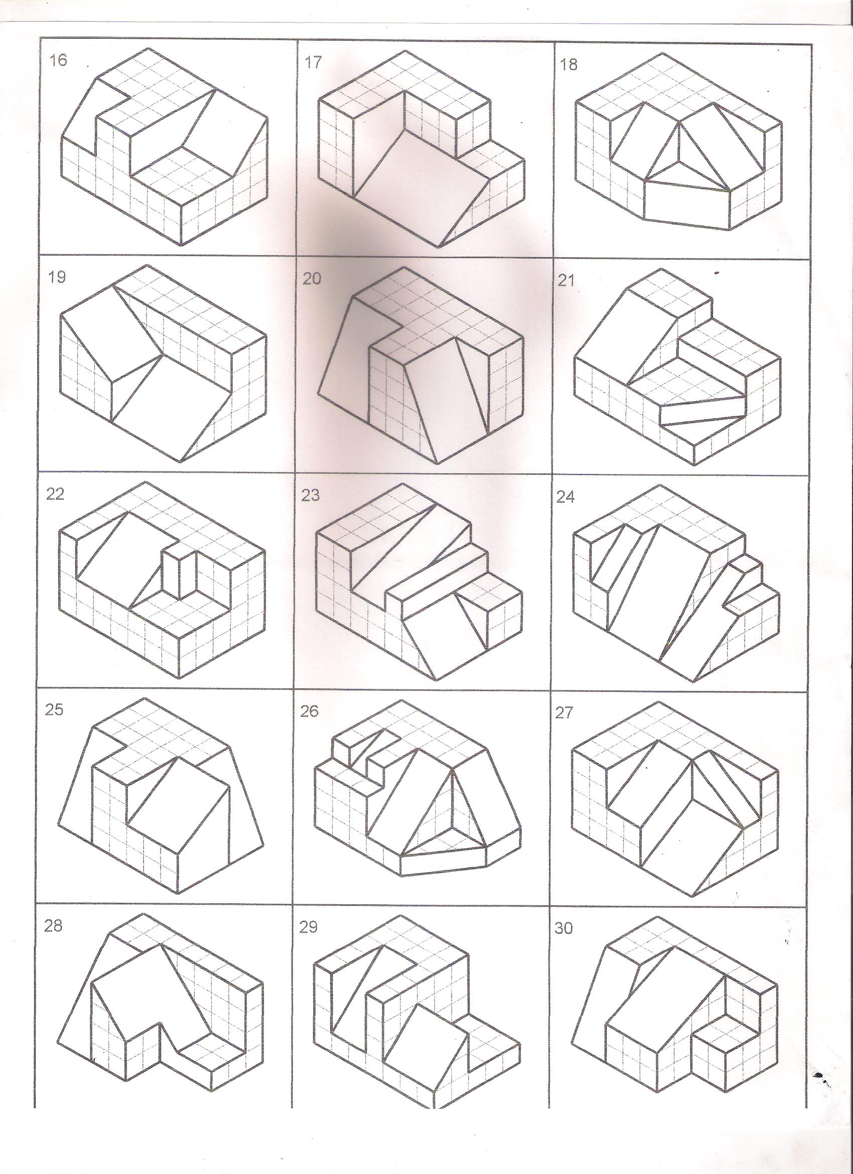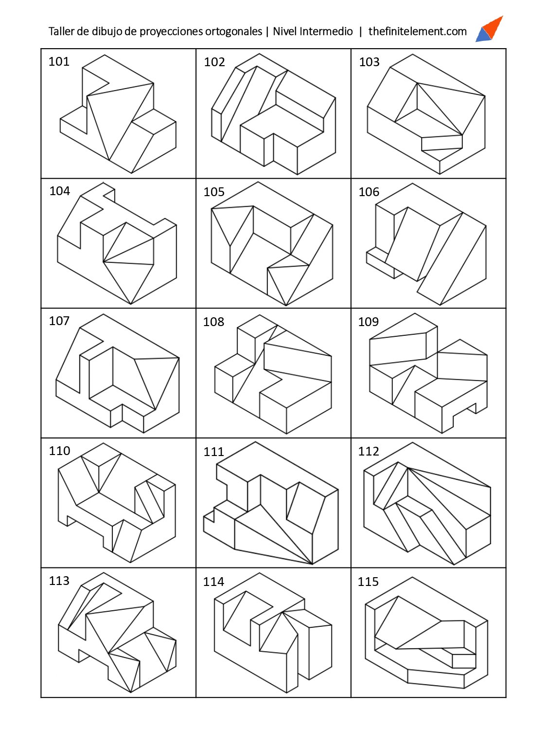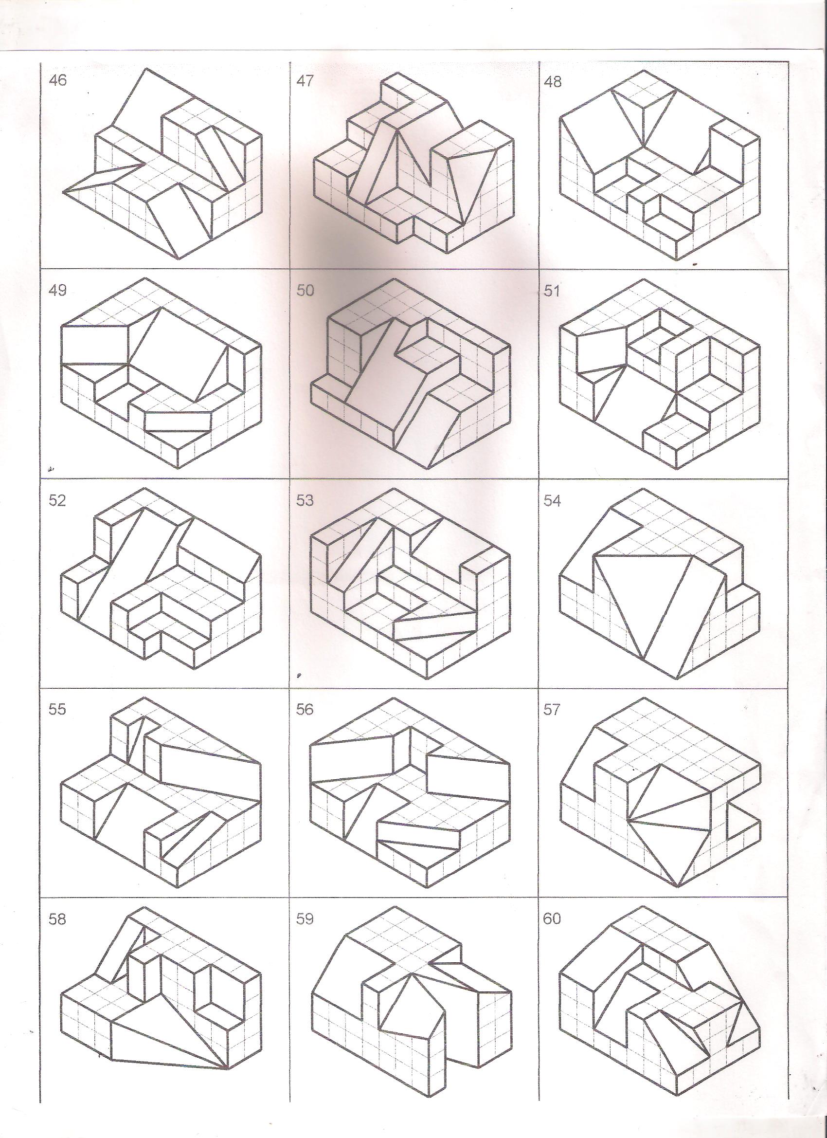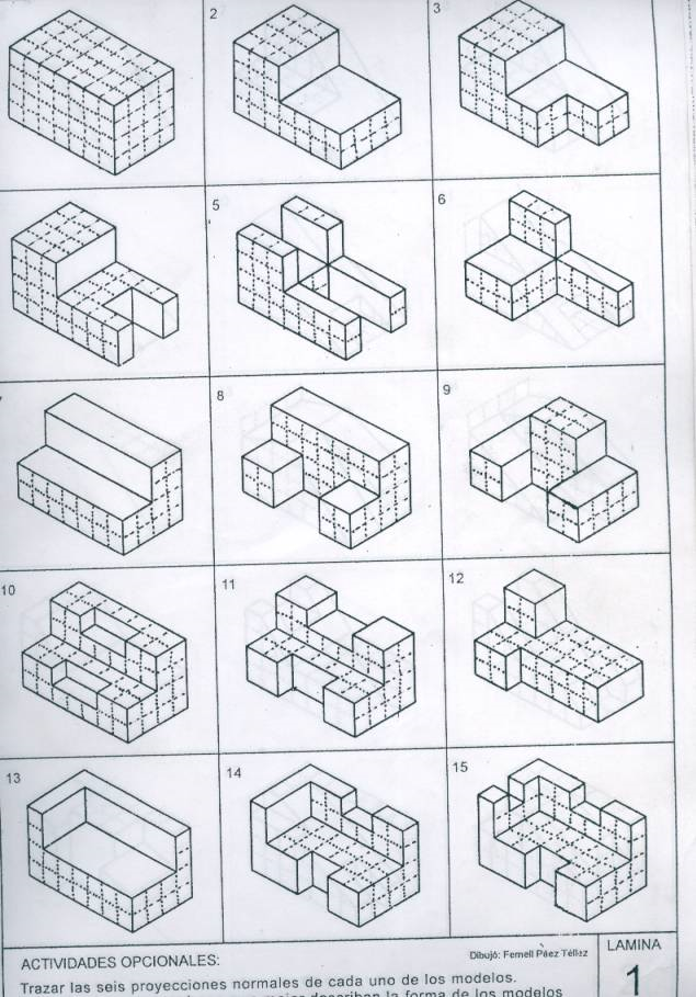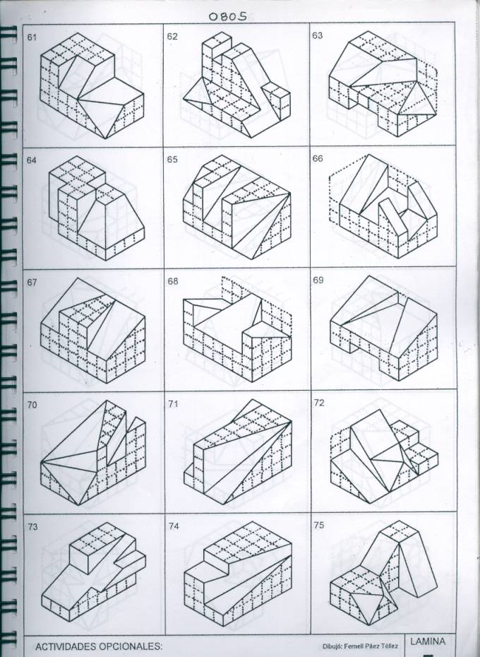 Los siguientes archivos contienen dibujos isométricos. El ejercicio consiste en obtener, en un principio, tres vistas o proyecciones ortogonales usando uno de dos sistemas de representación. Primer ángulo diedro o tercer ángulo diedro, también llamados primer cuadrante y tercer cuadrante. Muchos de los dibujos de los ejercicios presentados a continuación fueron realizados por el profesor Fernell Páez Téllez, quien autorizó el uso de los documentos. Para él todo el reconocimiento.
