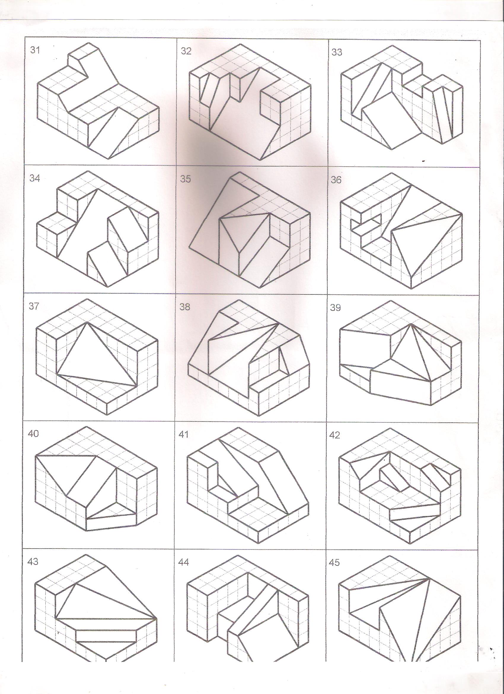 Vistas de isométricos con planos inclinados y oblicuos en tercer ángulo | 0802-18 y 45