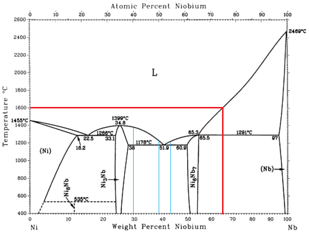 Trace sobre el diagrama de fases líneas punteadas que describen las tres siguientes aleaciones: (30%Nb+70%Ni), (38%Nb+62%Ni) y (42.2%Nb+57.8%Ni). Diga cuál de ellas seleccionará para realizar las soldaduras que unen las secciones que forman el tubo de escape de la motocicleta. Mediante un párrafo, de máximo cuatro renglones, justifique su respuesta en términos de los tipos y cantidades de microconstituyentes que formará la microestructura de la aleación seleccionada.
