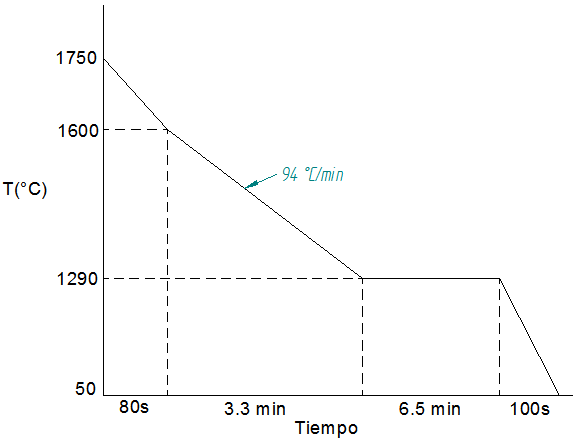Como tarda 80 segundos en iniciar la solidificación, entonces se cuenta ese tiempo sobre el eje X de tiempo, definiéndose así otro punto de coordenadas (80s,1600°C). Luego, teniendo la temperatura a la cual inicia la solidificación (1600°C) y la temperatura de 1290°C por debajo de la cual es todo sólido tenemos que el tiempo que transcurre el enfriamiento con pendiente de 94°C/min es: