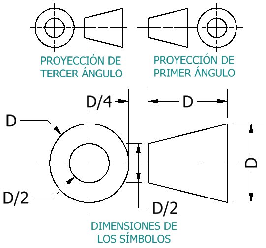 4. SÍMBOLO DE IDENTIFICACIÓN: se refiere al símbolo que indica el método de representación ortográfica. Los dos más usados son el método de proyección de tercer ángulo y el método de proyección de primer ángulo. Los símbolos de ambos métodos de proyección son: