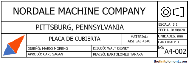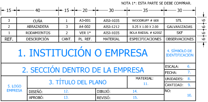 1. INSTITUCIÓN O EMPRESA: aquella que es propietaria del dibujo. Ejemplo: NORDALE MACHINE COMPANY. Usar siempre letras mayúsculas. Altura de la letra: 7 mm.