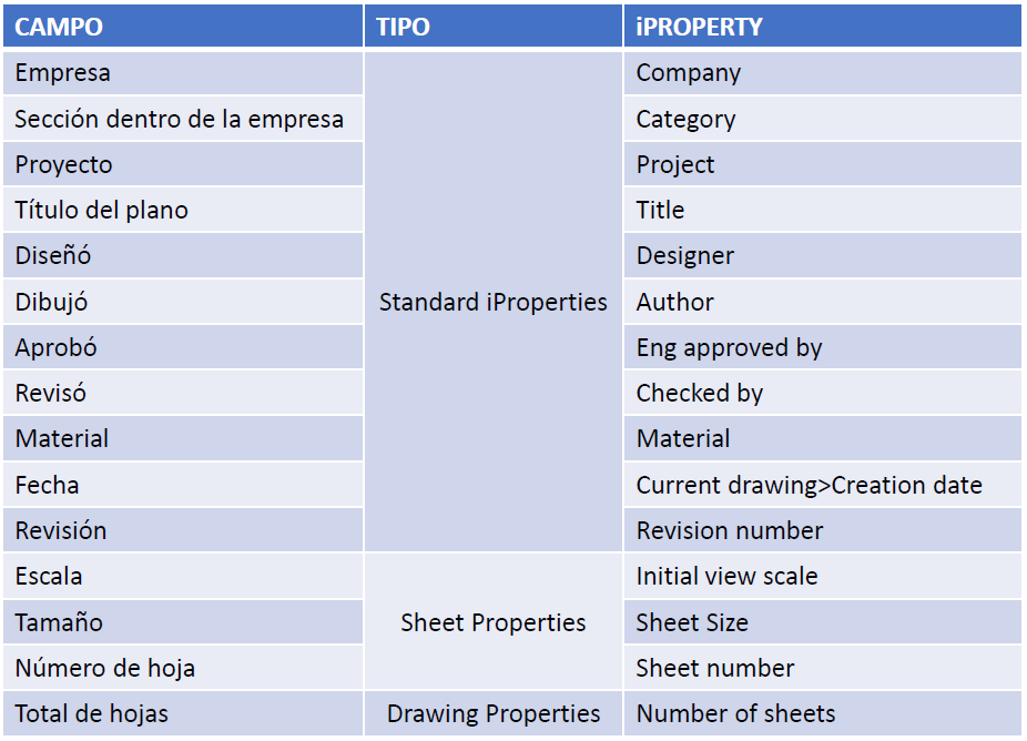 La imagen siguiente ilustra las propiedades de Inventor que podrían usarse para diligenciar automáticamente los campos a partir de la información contenida en el archivo de parte de donde se obtienen las vistas del plano.