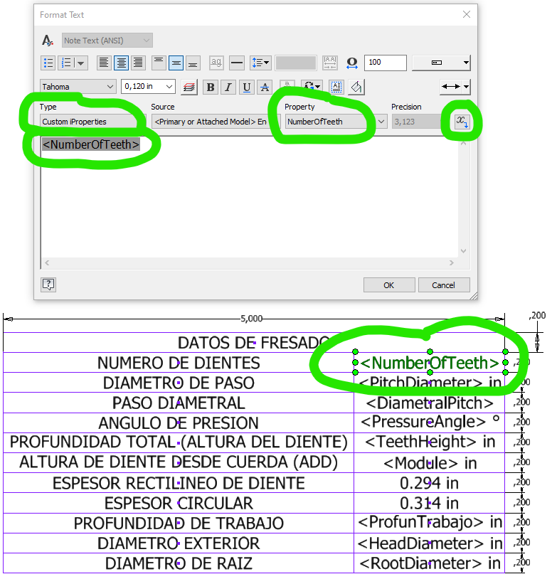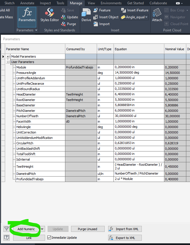 Al exportar, Inventor genera una lista de parámetros propios del engrane. Si falta alguno que sea importante para la lista de datos de fresado, inclúyalo en función de otros que si estén en la lista de parámetros. Cuidado con las unidades. Si estas no están bien escritas lo más probable es que los cálculos resulten incorrectos.