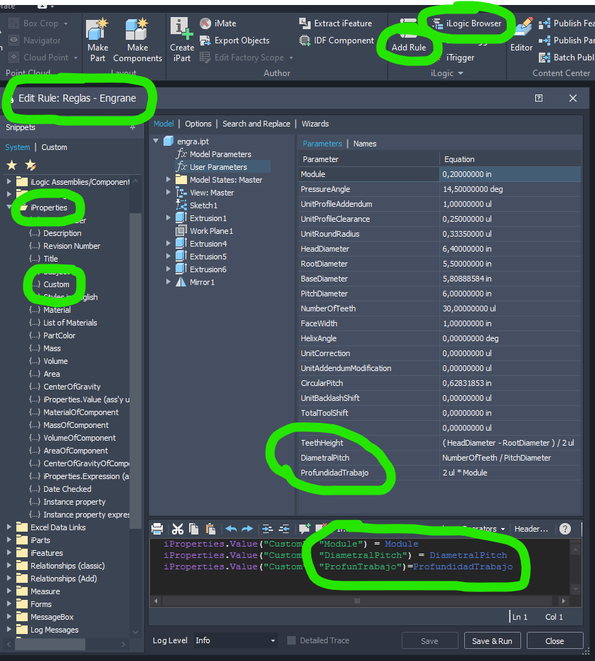 En la pestaña System, expanda "iProperties" (izquierda). Dé doble clic en "Custom". Aparecerá una línea de código en el espacio en blanco. Cambie el nombre de la propiedad "PropertyName" uno por uno para cada parámetro que quiera trasladar a las iProperties. Iguale cada línea a su respectivo parámetro. Quedará algo así:
