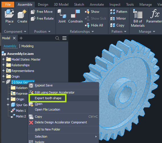 En el arbol del modelo (model Browser) de la izquierda, buscar el tren de engranes generado usando el acelerador de componentes, luego ubicar el engrane que desea exportar y dele clic derecho y luego "Export tooth shape". Seleccione el componente correspondiente (piñón o rueda) y luego dé clic en OK. Se abrirá una ventana de un cilindro que representa el engrane, el cual contiene un boceto con la forma de un solo diente (útil para el dibujo en el plano). Guarde la pieza. Ésta será ahora su pieza de trabajo. Puede modificarla a su antojo y obtener de ella una vista simplificada del engrane (sin dientes, sólo un perfil de diente y líneas que representan diámetro externo, diámetro de paso y díametro de raíz).