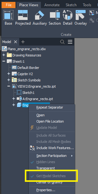 Crear una vista en el entorno plano (extensión .idw) del engrane (de la parte .ipt, no del ensamble) donde se observe de frente el engrane (como una circunferencia). Ubique el dibujo de la vista en el arbol de la izquierda (en el Browser), clic en más, luego clic derecho a la pieza .ipt del engrane. Luego clic en "Get Model Sketches". El perfil del diente del engrane y líneas que representan diámetros aparecerán. Cambie los tipos de línea. Use líneas ocultas para los diámetros de raíz y externo, y línea de eje para el diámetro de paso.