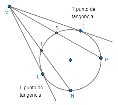 4. ÁNGULO EXTERIOR: El vértice es punto exterior a la circunferencia y sus lados son semirrectas tangentes y/o secantes a la circunferencia, por ejemplo los ángulos \(\angle{LMT}\), \(\angle{LMN}\) y \(\angle{LMP}\).