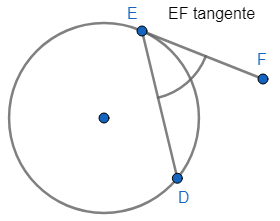 2. ÁNGULO SEMIINSCRITO: El vértice es un punto de la circunferencia y sus lados son dos semirrectas una tangente y la otra secante a la circunferencia, por ejemplo el ángulo \(\angle{DEF}\).