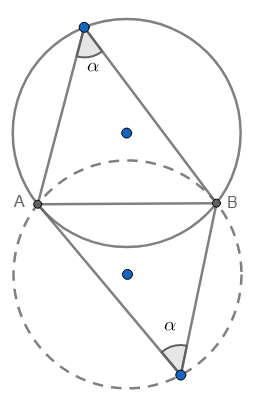 TEOREMA: Dado un segmento \(\overline{AB}\) y dado un ángulo, \(0° < \alpha < 180°\), entonces existen dos arcos de extremos A y B, (sobre circunferencias congruentes y simétricas con respecto a la recta AB), tales que la unión de dichos arcos, excepto los puntos A y B, forman el lugar geométrico de los puntos P del plano, para los cuales \( \angle{APB} = \alpha\).