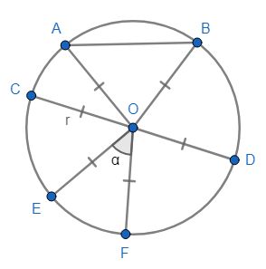 ÁNGULO CENTRAL: Ángulo cuyo vértice es el centro de la circunferencia, por ejemplo: \(\angle EOF=\alpha\).