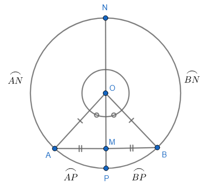 - Es bisectriz del ángulo central que la cuerda subtiende: \(\overline{OP}\) bisectriz de \(\angle{AOB}\) y \(\overline{ON}\) bisectriz de \(\angle{AOB}\).