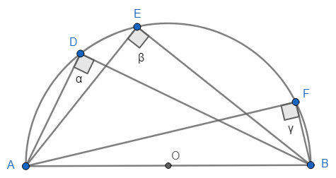 $$ \alpha = \beta = \gamma = \frac{\overset{\LARGE\frown}{AB}}{2} = \frac{180°}{2} = 90° $$