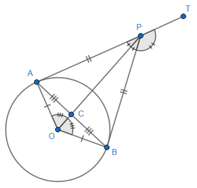 3. \(\angle{AOB}=\angle{TPB}\) (exterior) del cuadrilátero \(PAOB\).