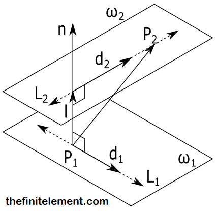 La operación anterior resultó en un vector \(\overrightarrow{n}\) perpendicular a ambos vectores \(\overrightarrow{d_1}\) y \(\overrightarrow{d_2}\) y, por ende, perpendicular a ambas rectas. Podemos ahora imaginar dos planos que contienen a cada una de las rectas. Estos planos pueden definirse usando el vector normal (\overrightarrow{n}\) hallado, luego, los planos serían paralelos.