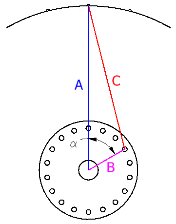 A continuación se presenta una formula para el cálculo de la longitud de los radios que unen el eje (hub) con el rin de la llanta de una bicicleta. Se reduce a un problema de trigonometría. Primero, se calcula la longitud del lado \(C\) del triángulo usando la ley de cosenos: