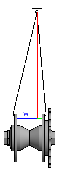 El ángulo \(\alpha\) depende del número de agujeros para los radios y de la disposición de los radios al ensamblar. Se debe tener en cuenta que el triángulo ABC anterior está en el mismo plano que los orificios para los radios que tiene el rin, lo cual aún no brinda la medida requerida de la longitud del radio, dado que estos no van radiales sino con un ángulo con respecto a dicho plano, el cual generalmente es diferente a un lado y al otro. Por esta razón, se requiere de un segundo paso, donde calculamos la longitud \(L\) del radio en función de \(C\) y la distancia \(w\) indicadas por la línea azul o por la línea verde en la Figura 2. Se introduce una corrección al restar al cálculo mediante el teorema de Pitágoras la mitad del diámetro de los agujeros para los radios del eje (ver Ec. 2).