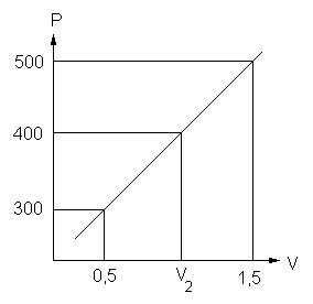 Como sabemos que P varia en forma lineal con el volumen, entonces podemos hacer una interpolación lineal con la información que tenemos, para hallar datos para determinar el estado 2: se sabe que a 300 kPa el pistón empezará a flotar (V = 0,5 m3) y que si la presión fuera de 500 kPa el volumen sería 1,5 m3.