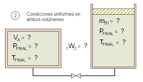 Dos recipientes se llenan con aire, uno es un depósito rígido A y el otro un conjunto de pistón y cilindro, B, que está conectado a A por medio de una tubería y una válvula, como se muestra en la figura. Las condiciones iniciales son: